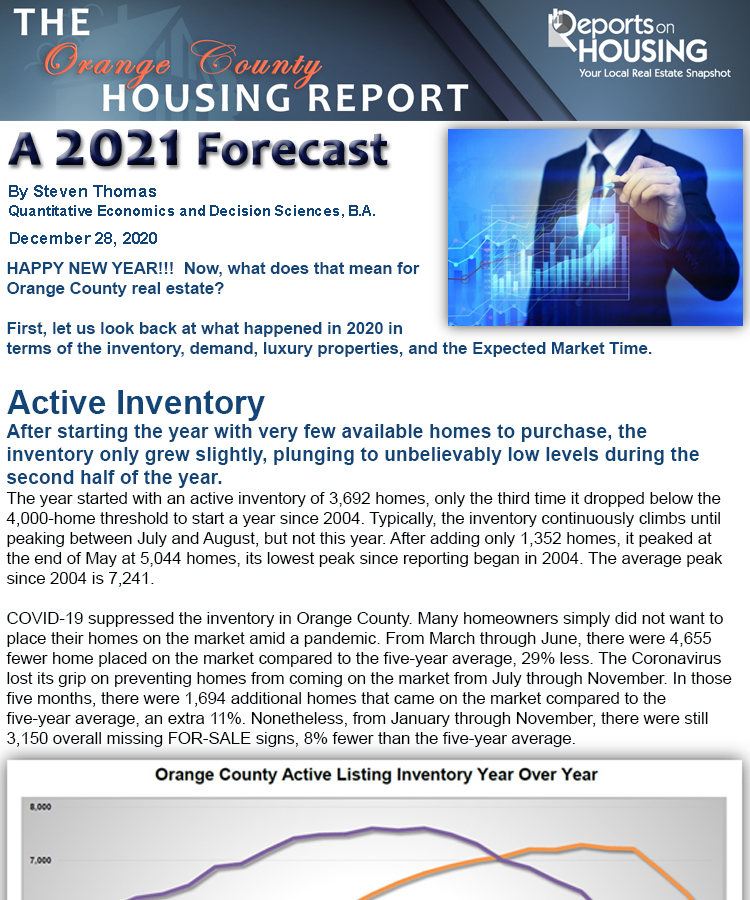 COVID-19 suppressed the inventory in Orange County. Many homeowners simply did not want to place their homes on the market amid a pandemic. From March through June, there were 4,655 fewer home placed on the market compared to the five-year average, 29% less. The Coronavirus lost its grip on preventing homes from coming on the market from July through November. In those five months, there were 1,694 additional homes that came on the market compared to the five-year average, an extra 11%. Nonetheless, from January through November, there were still 3,150 overall missing FOR-SALE signs, 8% fewer than the five-year average.
