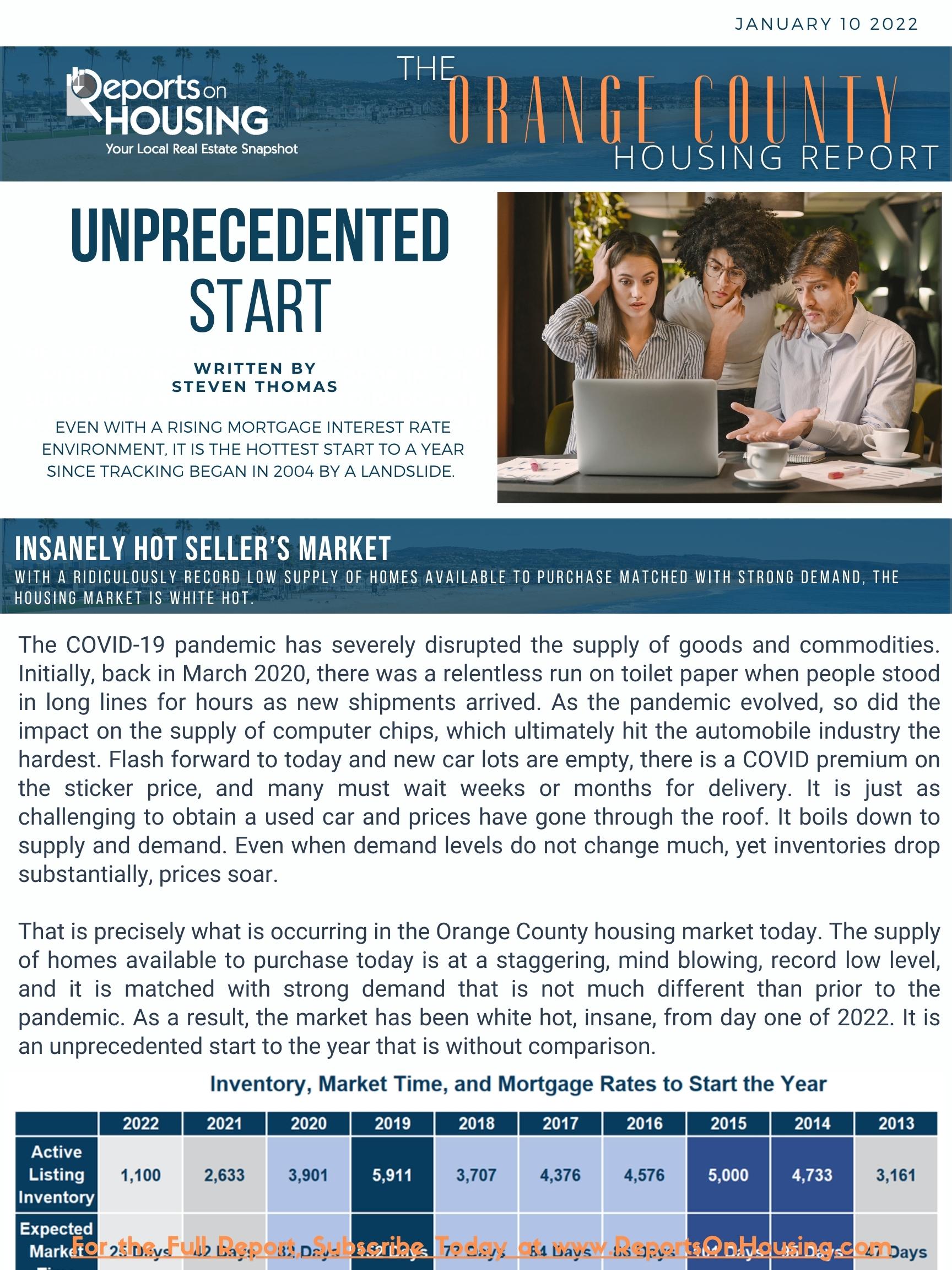 That is precisely what is occurring in the Orange County housing market today. The supply of homes available to purchase today is at a staggering, mind blowing, record low level, and it is matched with strong demand that is not much different than prior to the pandemic. As a result, the market has been white hot, insane, from day one of 2022. It is an unprecedented start to the year that is without comparison. On January 3, 2013, according to the Primary Mortgage Market Survey conducted by Freddie Mac for the past 51-years, mortgage rates were at 3.34%, slightly higher than the record low, at the time, of 3.31% achieved on November 21, 2012. On January 7, 2021, mortgage rates hit a 17th record low since the start of the pandemic, dropping to 2.65%. That rate remains the record today, a year later. On January 6, 2022, mortgage rates had risen to 3.22%, the highest level since May 2020. Even with higher, rising mortgage rates, the housing market already has exceptionally strong momentum.