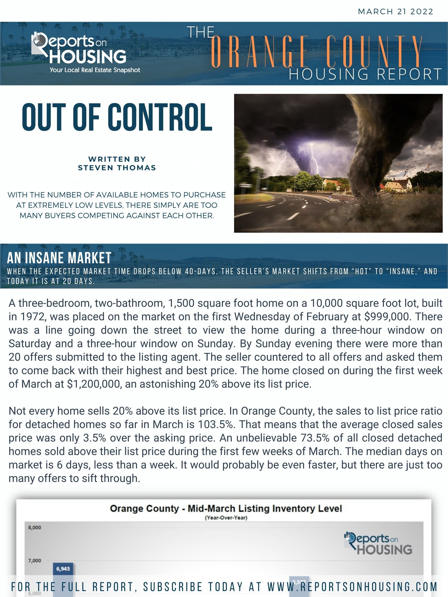 Not every home sells 20% above its list price. In Orange County, the sales to list price ratio for detached homes so far in March is 103.5%. That means that the average closed sales price was only 3.5% over the asking price. An unbelievable 73.5% of all closed detached homes sold above their list price during the first few weeks of March. The median days on market is 6 days, less than a week. It would probably be even faster, but there are just too many offers to sift through.